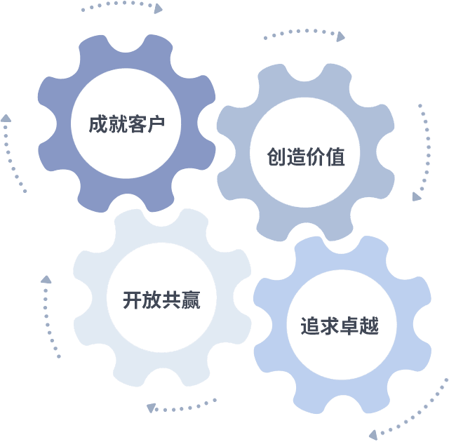 成就客户是一切决策的出发点,,,,创造价值是衡量所有工作的标准,,追求卓越是我们做事做人的态度,,开放共赢是我们的格局也是最终的结果。。价值观的齿轮环环相扣,,,推动着组织里的每个人不断向前。。